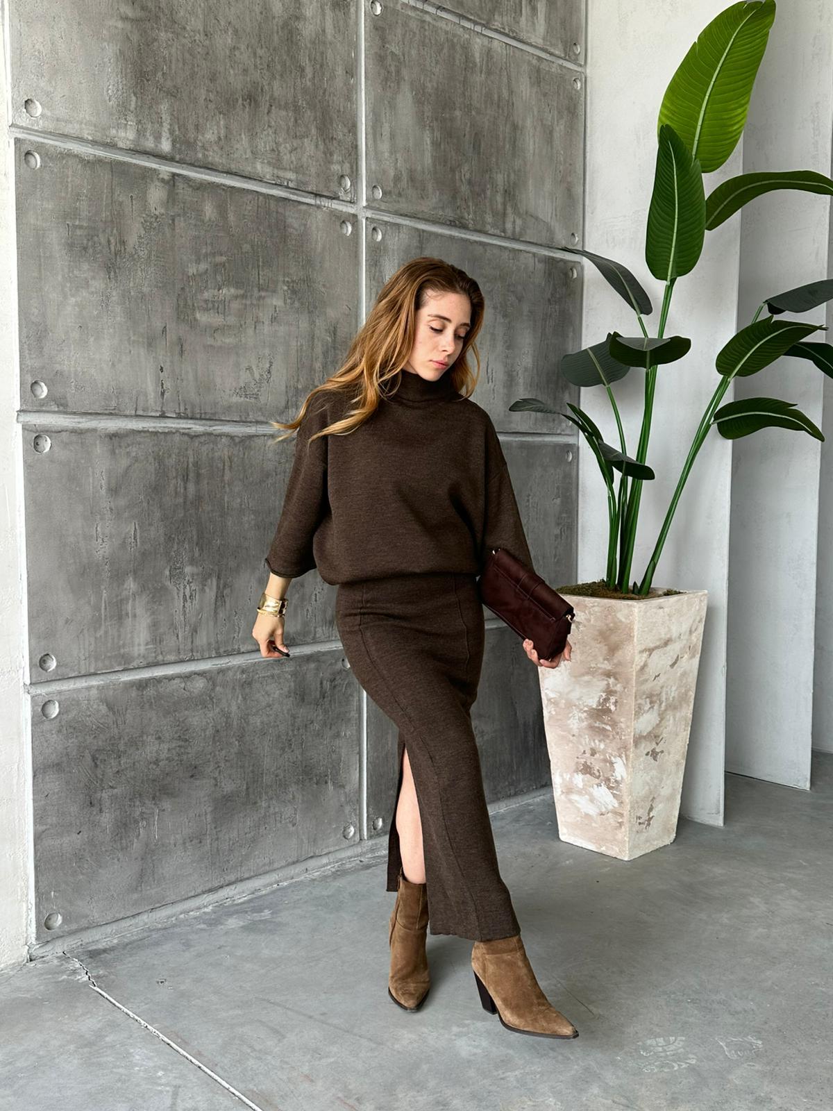 Etekli Geniş Kollu Triko Takım Kahve
