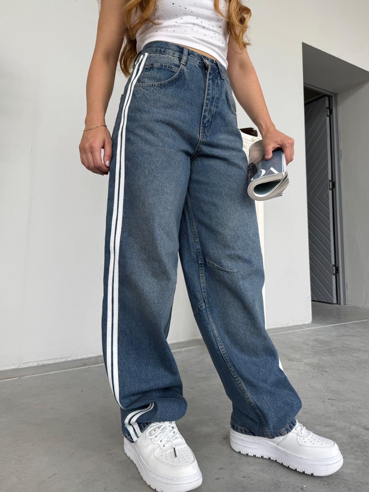 Şeritli Bel Tokalı Baggy Kot Pantolon