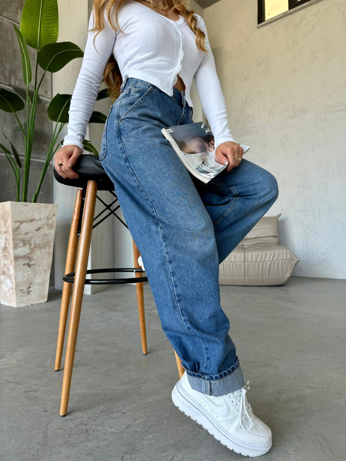 Yan Cep Boyfriend Pantolon Yıkamalı Tint Blue